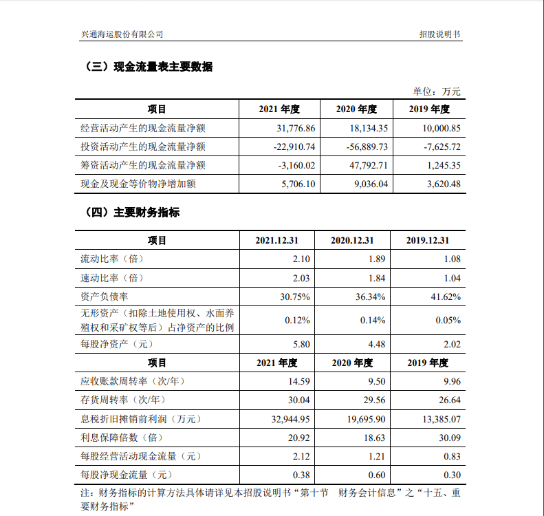 从业绩表现来看,兴通股份近年来盈利能力稳步增强。招股书显示,2018年至2021年底,公司的营业总收入分别为26889.23万元、29194.67万元、38641.76万元、56686.12万元,2018-2021年的年均复合增长率为20.50%;归母净利润分别为4551.95万元、8,681.35万元、12349.60万元、19908.53万元,2018-2021年的年均复合增长率为44.61%。
