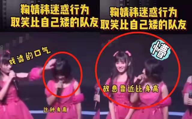 在舞台上,队友被采访到认为谁是对内最萌的,鞠婧祎打断队友讲话说:“她自己就很萌啊,这种身高”,然后又故意站在队友身边比身高。关键是鞠婧祎本身自己也不高啊,还嘲笑队友长得矮,即便是开玩笑,但这种公共场合开队友身高的玩笑也不太合适吧。