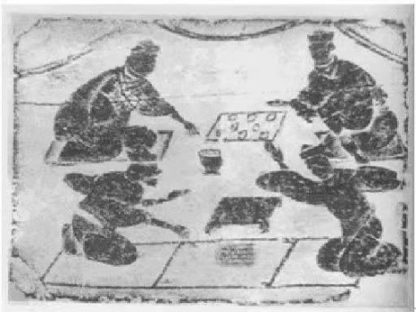 图中有一案,案上有耳杯、一盂,大概在进行对博饮茶。