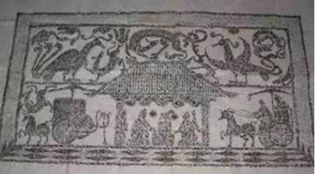前方车马歇停,后面行人又至。亭上祥鸟瑞兽腾飞,寓意吉祥如意。
