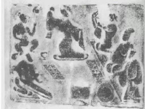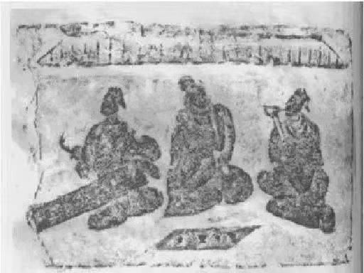 *图上三人,左一人鼓瑟,右一人吹笙,中间一人抚耳静听。三人面前一案,上有耳杯。