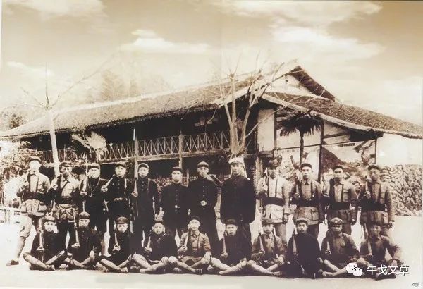 这是南方三年游击战争时期,曾山、刘英、粟裕和警卫战士的合影。除三名首长外,十九名警卫战士的驳壳枪全部结合了木壳。