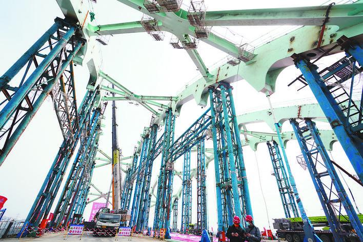 3月27日,引江济淮工程(江淮沟通段)大型市政桥梁——繁华大道桥主桥拱肋顺利合龙。该桥为我省首座公轨合建双层钢桁架特大拱桥,预计年底将完工通车。安徽日报记者 李博 摄