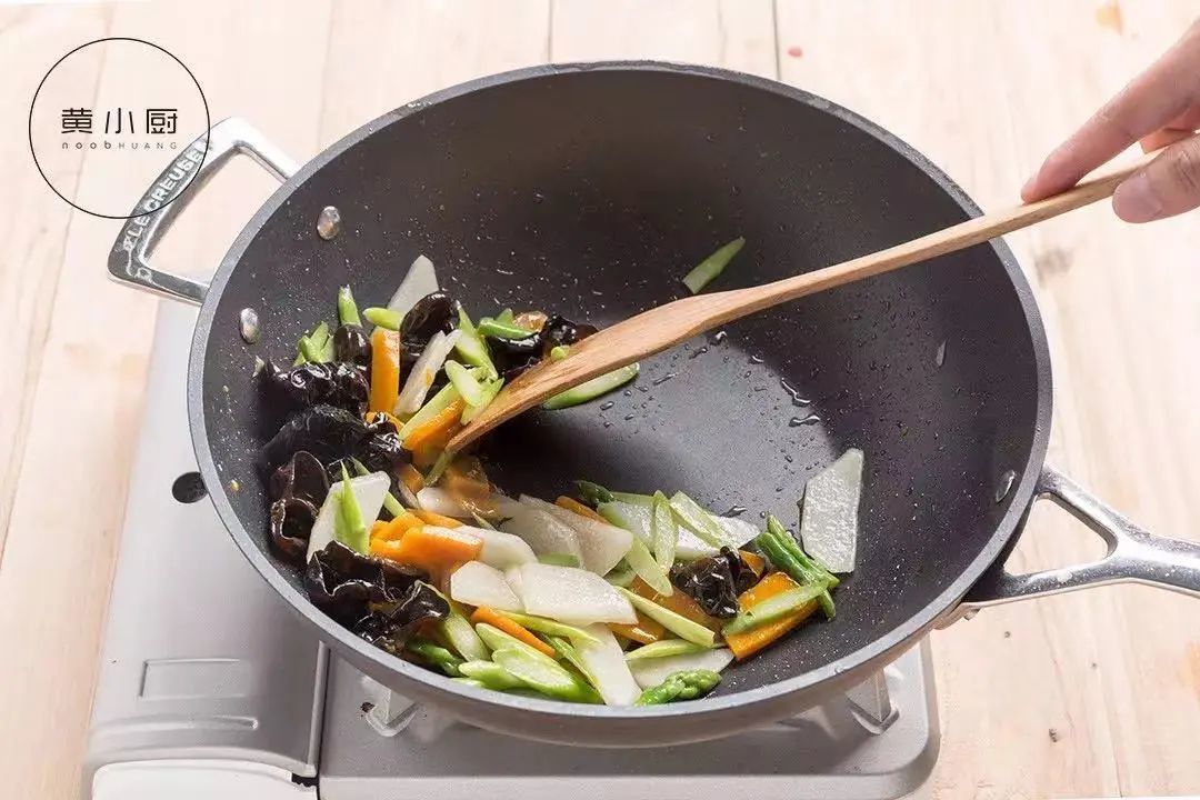 山药、南瓜去皮切片,芦笋切成滚刀状,木耳泡发洗净撕成大片,依次放入锅中焯水后盛入盘子中备用; |