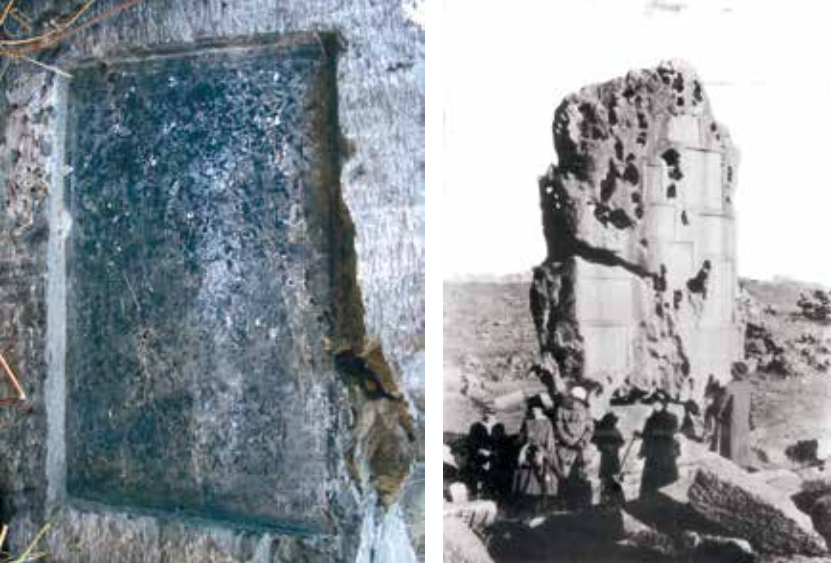 左图为“玲峰”石上的乾隆御笔,右图为被炸毁前的文源阁“玲峰”石旧照。