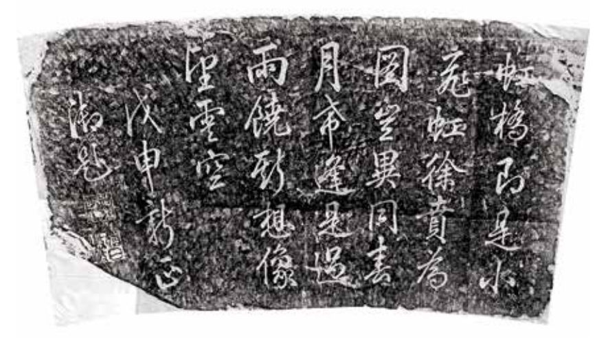 虹桥戊申新正御题(虹桥南面东5石)拓片。释文:虹桥即是小飞虹,徐贲为图岂异同。春月希逢是过雨,饶斯想像望云空。戊申新正御题。