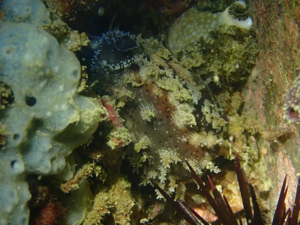 动物的颜色有变化,通常黑色。外套膜上有密集的小型浅灰色斑点及不规则的浅灰色斑。乳突起为褐色到白色,有的分枝。水管亦黑色,具缨须。触角细长,基部黑色,上部为褐色。
