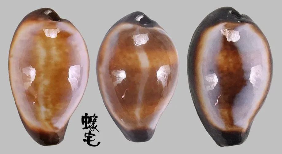 贝壳两侧和腹面黑褐色或黑色,背线较宽,形态常有变化。腹面稍平,呈黑褐色,壳口稍宽,两唇齿较粗。