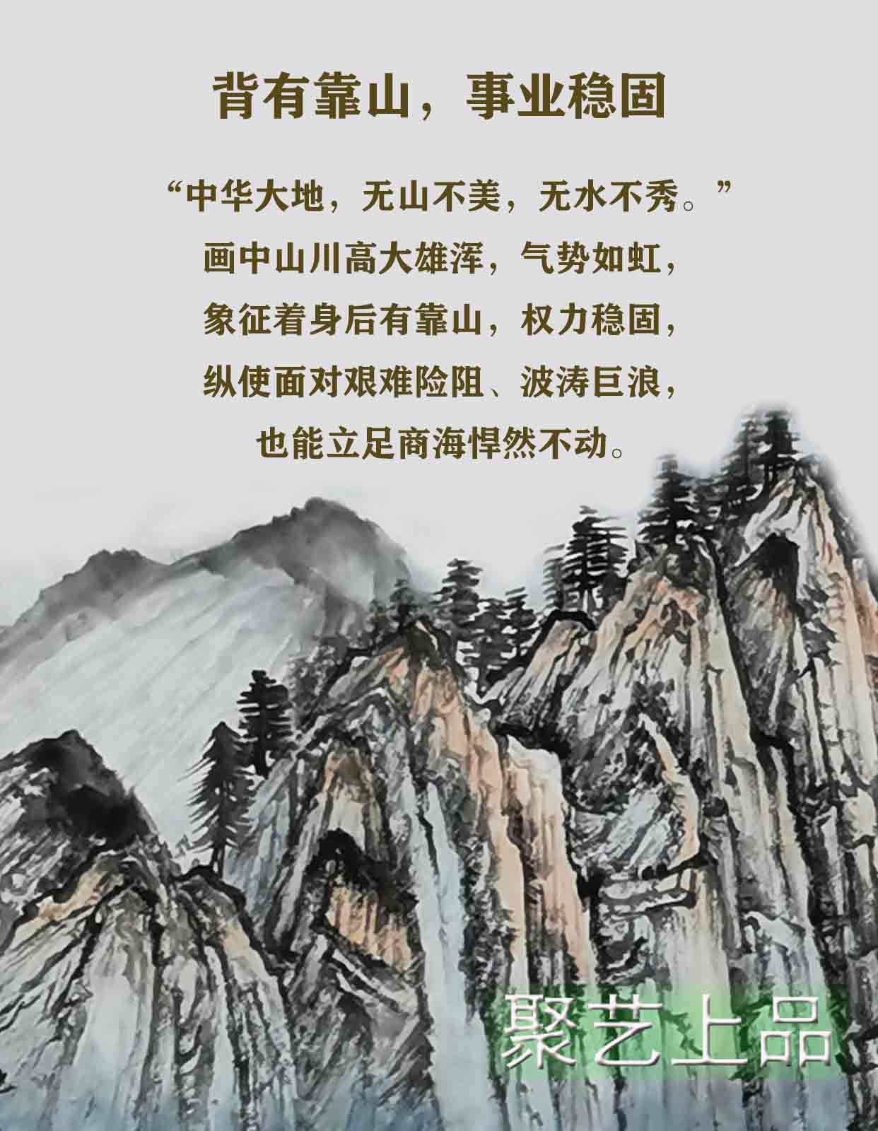 画中山川高大雄浑,气势如虹,象征着身后有靠山,权力稳固,纵使面对艰难险阻、波涛巨浪,也能立足商海悍然不动。