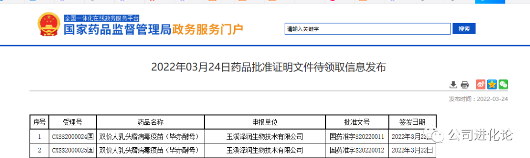 3月24日,国家药品监督管理局官网的“批件发布”栏公布,玉溪泽润的双价人乳头瘤病毒疫苗(毕赤酵母)获批,批准文号分别为国药准字S20220011、国药准字S20220012。