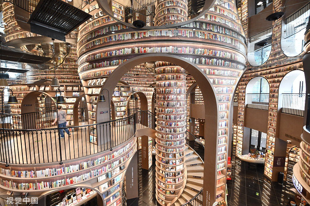 2022年3月28日,成都,都江堰钟书阁书店因其独特的空间设计吸引了一些读者前来拍照打卡。 这家书店在装修上使用了相当多的玻璃镜面,走进书店内部,会让人感觉空间特别大,四周也充满着魔幻感,如同走进了一座“奇幻森林”。