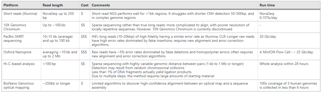 图5. 多种测序技术对结构变异检测的比较。来源:Genome Biology
