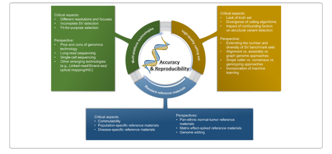 标准的参考信息可用于评估SV检测的假阳性和假阴性率。 具体而言,参考信息可用于评估测序技术的准确性和可重复性,优先考虑导致系统错误的测序混杂因素,并建立SV检测的最佳实践。在实际操作中,广泛使用包含充分表征的遗传物质或合成掺入对照的参考标准,可以用来校准测序平台和评估SV检测能力。因此,充分表征和广泛可用的参考样本是评估SV检测准确性和重现性以及了解数据准备或分析中潜在偏差的基础。