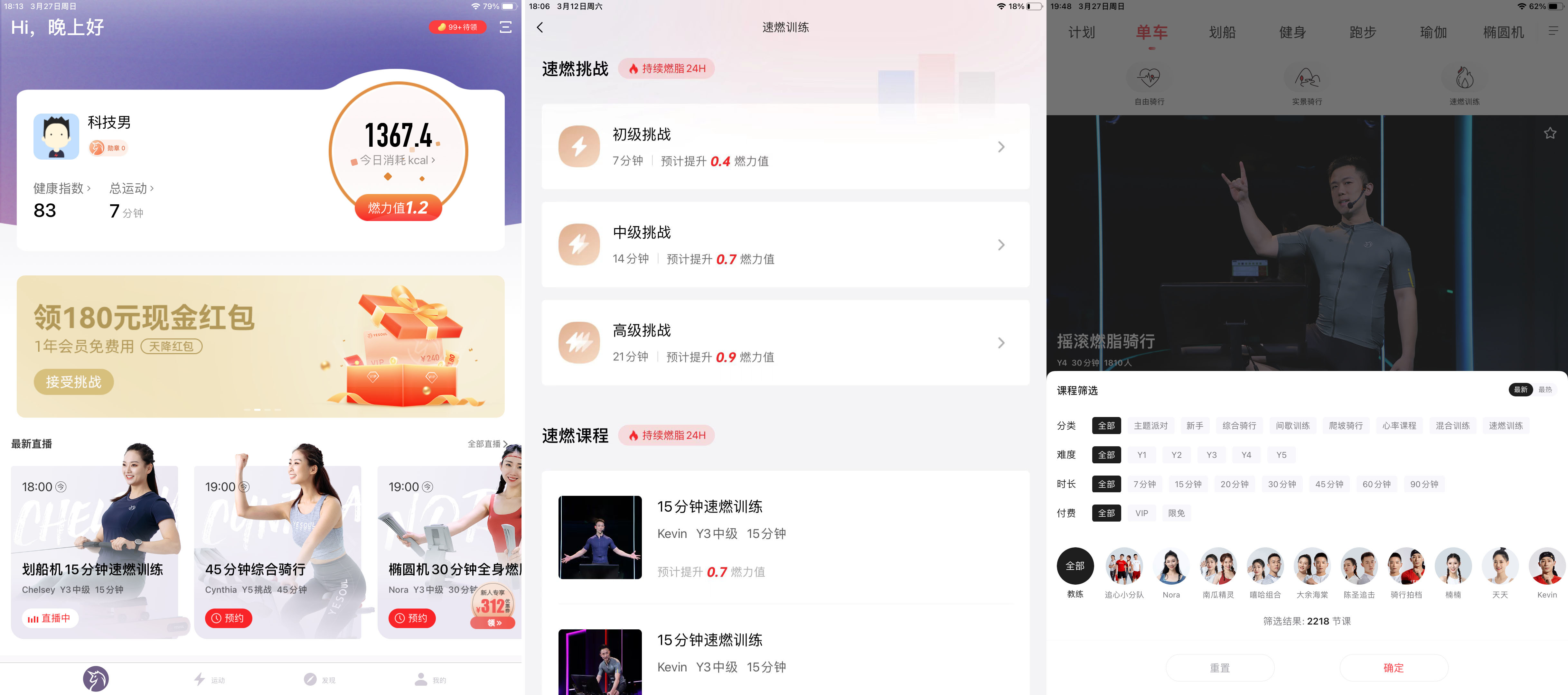 因为野小兽不仅仅做单车,还做各式各样的健身器材,这个app同样也适用划船机、跑步机、椭圆机等,而单车里还有3种模式,自由骑行,实景骑行,速燃训练。