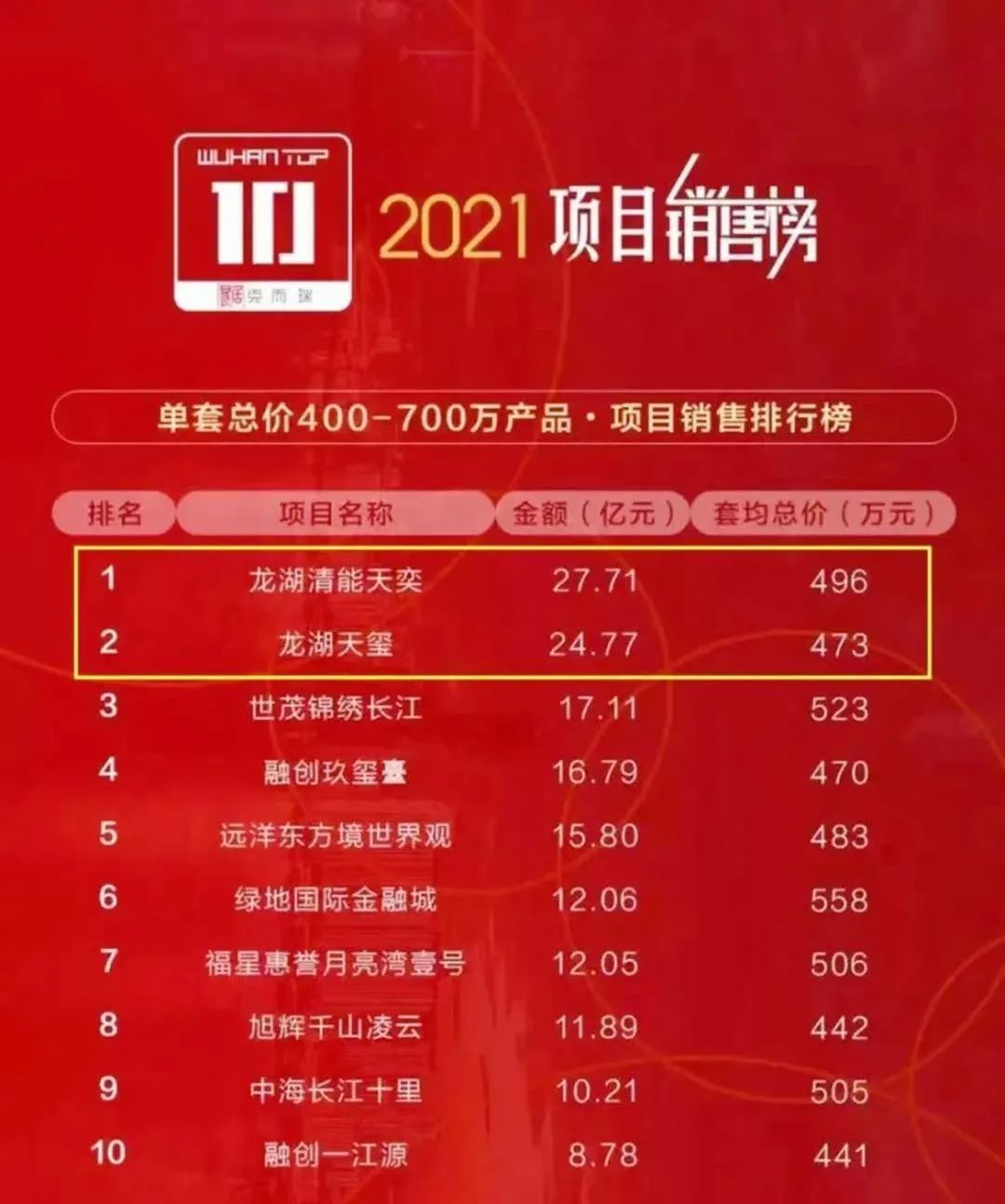 清能清江锦城、龙湖清能·天奕常年霸占武昌区月销量榜前列,并一举问鼎2021年武汉400万以上豪宅榜冠亚军。