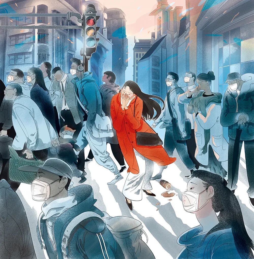上班路上,所有人戴着口罩,一位身着红衣的女性在人群中打翻了咖啡,双手捂着嘴巴,旁边的人,有的掩面退后,有的漠不关心。