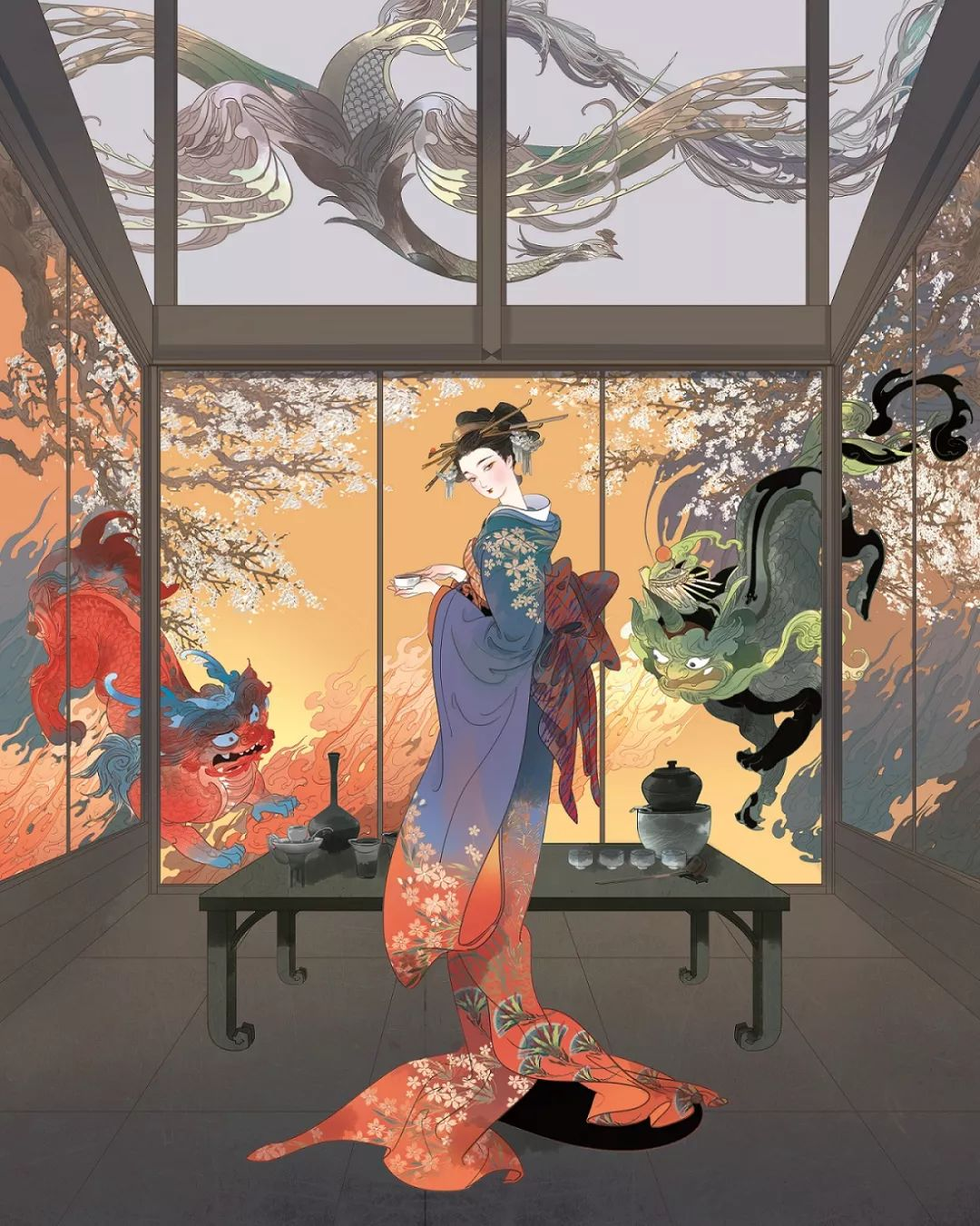 比如,为《三体艺术画集》创作时,阿梗选择了“茶室”作为背景,屏风上是争斗的瑞兽和燎原的火花,画面中央的三体人智子奉茶时眉目低垂下,却给了一个野心勃勃的回眸。
