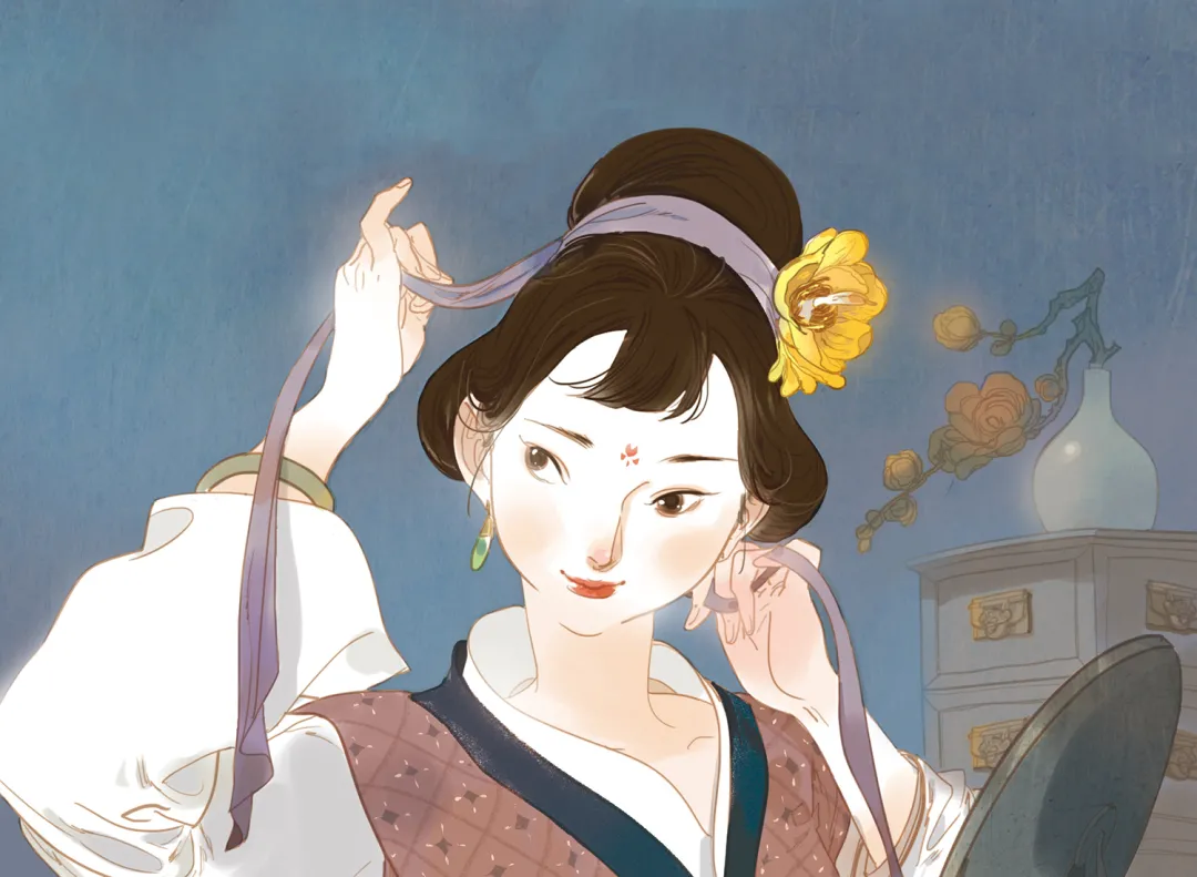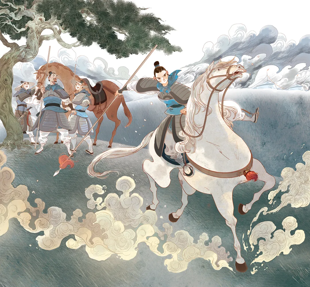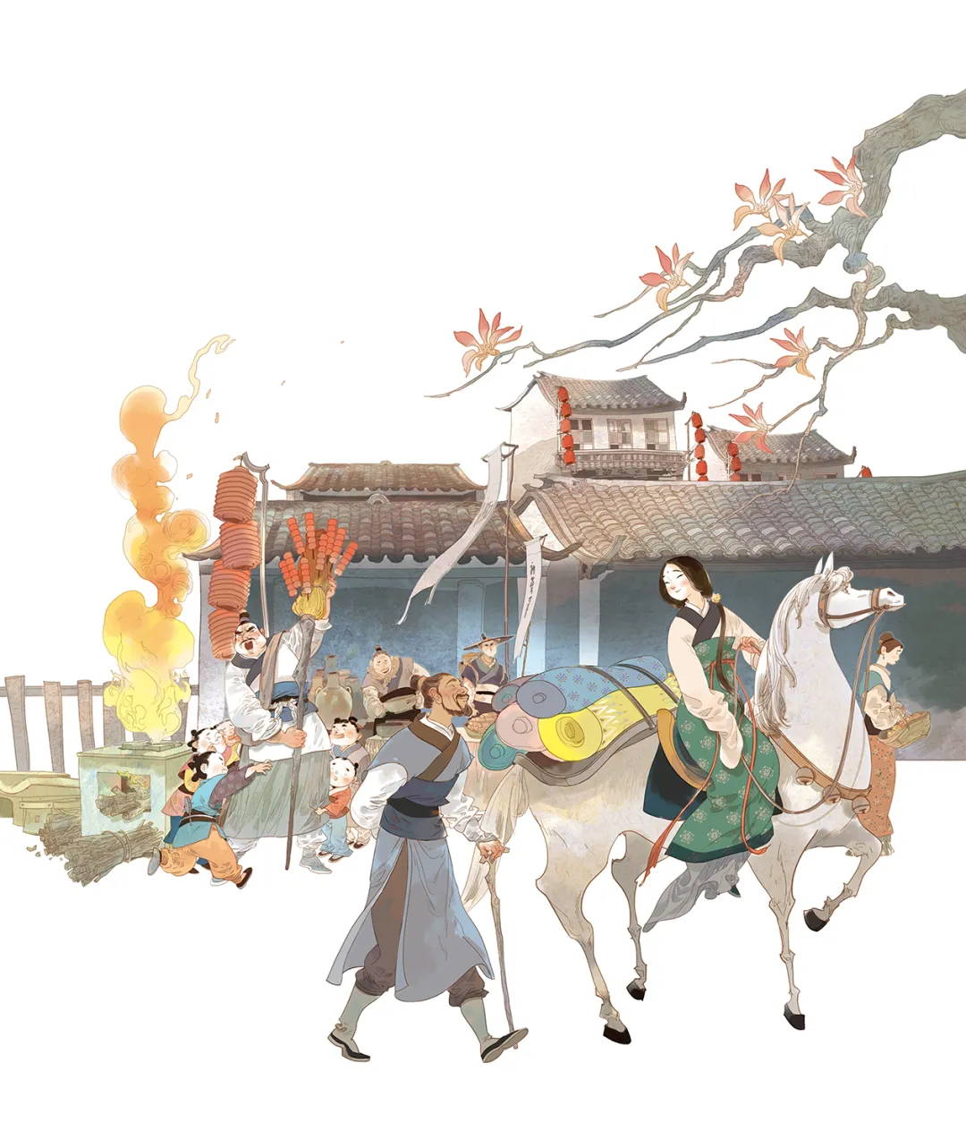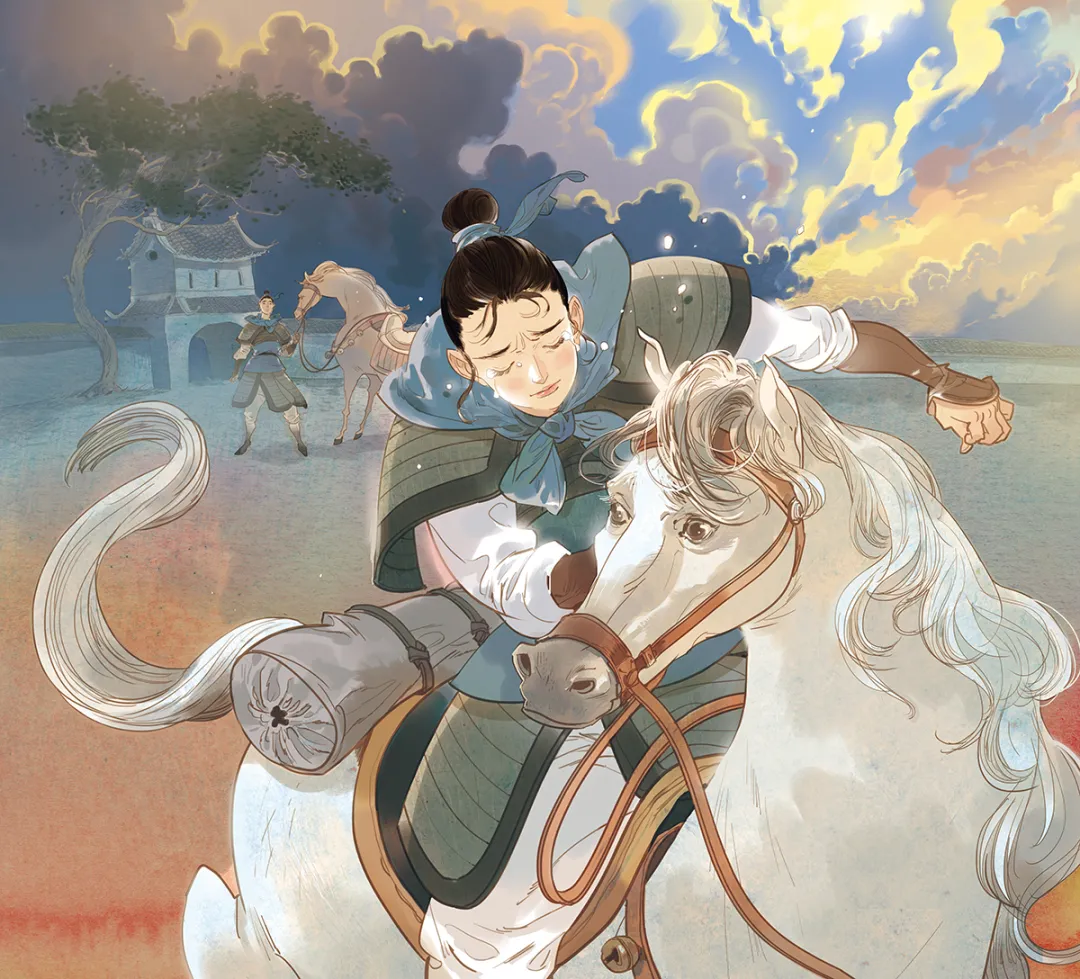 为英国牛津出版社绘制的英文版《花木兰》插图,则凸显了女性柔美与刚毅同在的气质。
