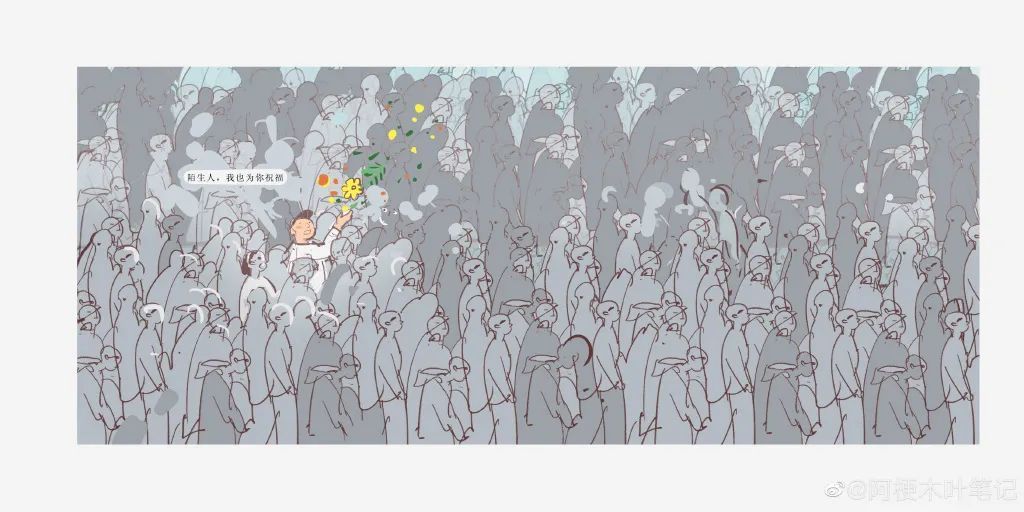 主角林晓路,几乎完全融入人潮之中,但与其他人不同的是,她是唯一回头的人,因此成为了整张画的核心。