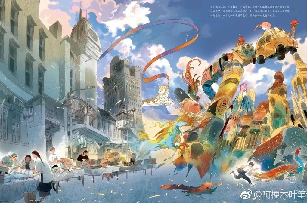 阿梗说:“我对手绘更加敏感,是个纸张的痴迷者。但是手绘和板绘并没有高下之分,只是作画的载体不同,作品的人文内核,才是我创作的关键。”