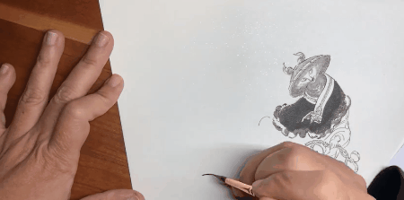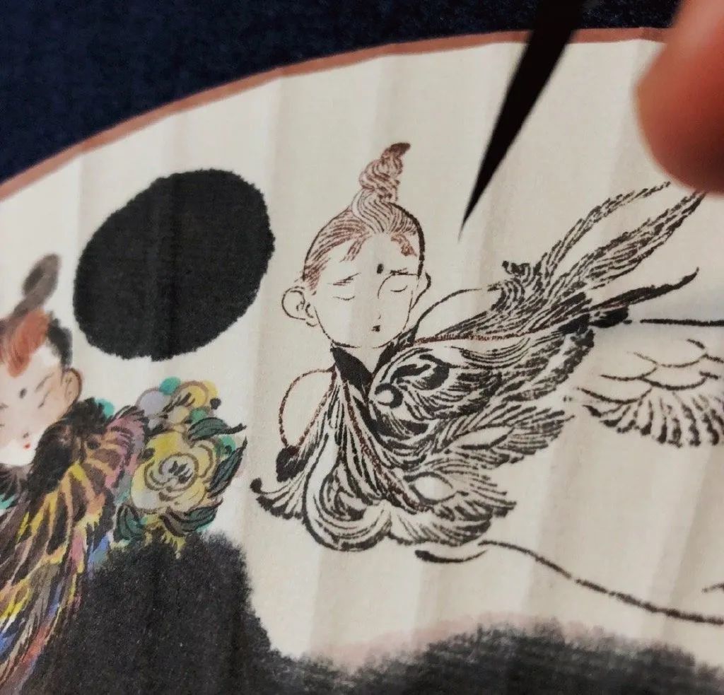 看阿梗创作,是一件非常享受和解压的事情,她下笔果决,拿着毛笔,沾上墨水,在纸上飞舞勾勒,行云流水。
