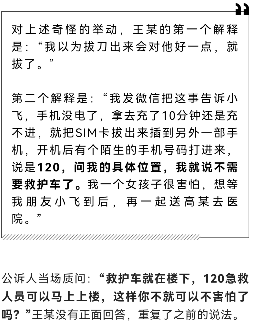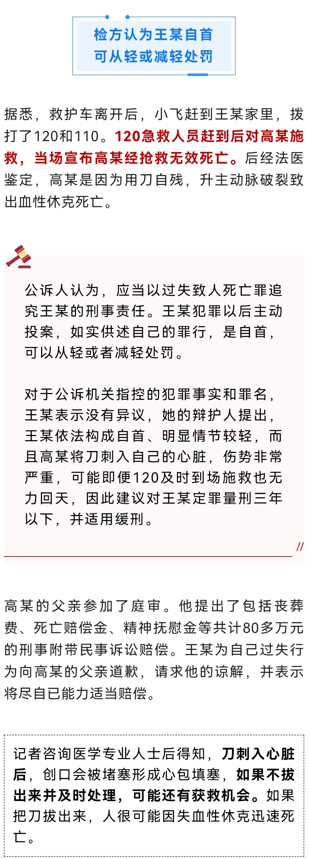 高某走到客厅门口处,背对王某蹲了下来,然后站起来转身朝王某走去。王某迎上去,两人面对面抱在一起。高某渐渐瘫软,仰面倒在地上,此时,王某才看到,高某的右侧胸口插着一把没有刀柄的刀。 王某把刀拔出来,拍打高某的脸、掐他的人中。 之后,王某拨打了120急救电话,接线员让其用手紧按伤口。