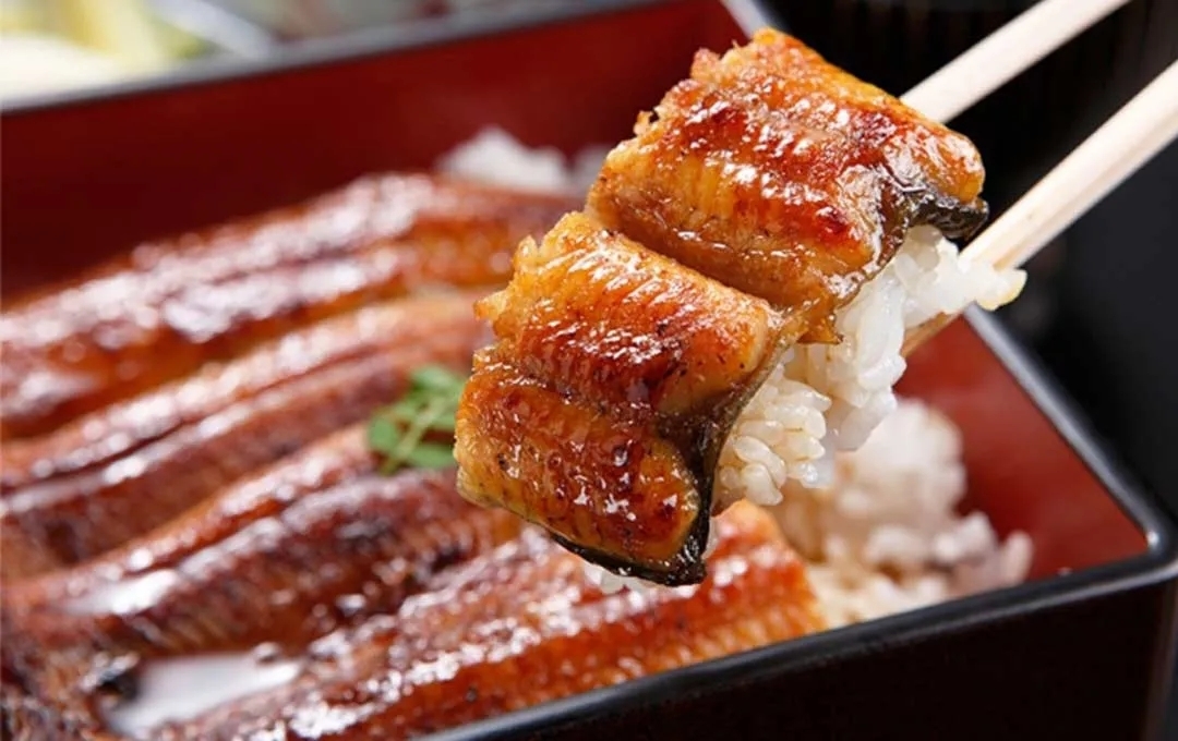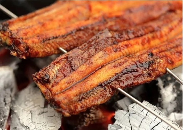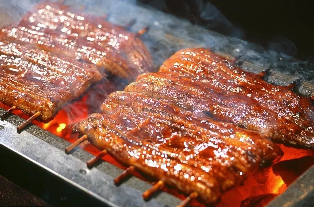 日本人痴鳗,把鳗鱼吃出了花样、吃出了水平。日本传统的鳗鱼料理,有鳗鱼三明治或鳗鱼汉堡、鳗鱼米饭团、鳗鱼扁豆沙啦、鳗鱼盖浇饭、拍鱼肉、鳗鱼饭、白烤鳗、鳗鱼散、鳗鱼海带卷、混煮鳗鱼、茶浸鳗鱼、鳗鱼米饭卷等十二种,而鳗鱼饭是其中最被人称道的。鳗鱼饭的鳗鱼,都要经过烤的。“蒲烧”和“白烧”是最常见的两种料理方法。根据江户时代的风俗志《守贞谩稿》记载,“蒲烧”是指将鳗鱼去骨、切片、串起烤制,食用时多搭配山椒粉。“蒲”是长在水边的植物,嫩草即是蒲草,嫩芽就是草芽,都可以当蔬菜吃,它结出的棒状果穗,我们称为“蒲棒”,因为烧鳗鱼的形状和颜色正好和香蒲的穗很相似,所以称为“蒲烧”。“白烧”是指不沾任何酱汁和调味品,只用盐进行烤制,这样比较能吃出鳗鱼的原味。鳗鱼是多脂少水的优质鱼,每百克鳗鱼,脂肪含量高达33克,这在鱼类中是妥妥的油王,而且其中75%是不饱和脂肪酸。多脂的鱼类,鱼味足是它们的优点,但过于肥腻也是它们的缺定,蒲烧鳗鱼饭扬长避短,是烹制鳗鱼的最佳方式:高温烧烤,鳗鱼发生美拉德反应,大分子没有味道的蛋白质分解为小分子充满鲜味的氨基酸,部分脂肪因受热后肌肉蛋白凝固收缩被挤了出来,脂肪受热,变成香味诱人的鳞脂,用鳗鱼骨、酱油、味醂、昆布、糖等原料熬制而成蒲烧汁,增香增鲜又解腻,加上优质的米饭,吃起来就没那么油腻,米香是脂香的知音,米饭是鱼的最佳搭档,这样的组合,简直就是神来之笔。