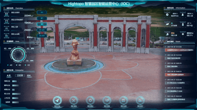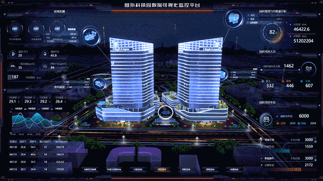 选用图扑软件(Hightopo)的可视化引擎以及地理信息系统(Geographic Information System,GIS) 相关技术,对智慧园区运营中心(Intelligent Operations Center,IOC) 进行全方位的数字化建设,一屏展示园区全貌以及园区内建筑、招商、运营、楼宇等相关信息,实现园区的统一管理、监控、预警、调度等一体化建设。