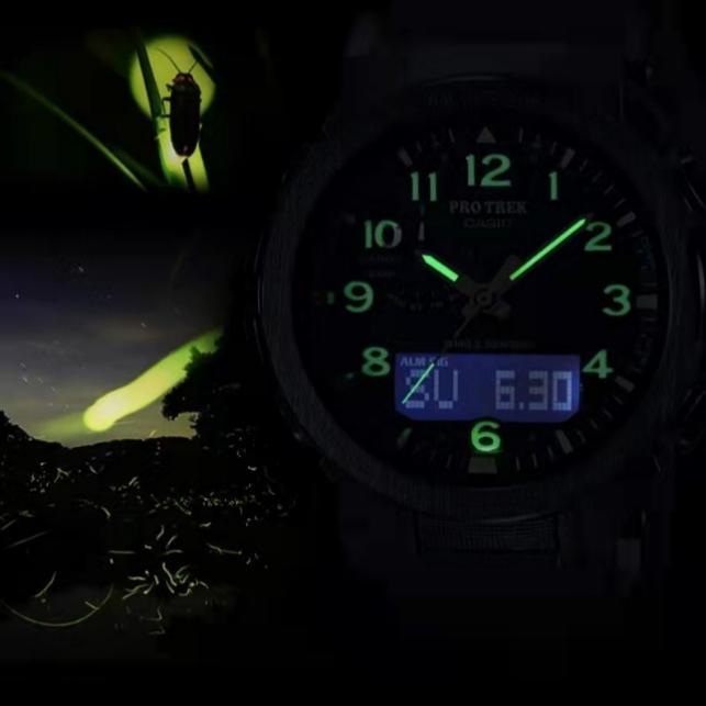 而表盘的亮度设计亦是本系列体现维系自然的重点,采用萤火虫的亮度。萤火虫是山林的象征,PRW-51NJ在表盘上的时间刻度,在夜间以红色和绿色显示,这一夜间照明配色灵感正是来源于萤火虫。同时指针和刻度采用了蓄光技术,即使在黑暗中亦能释放柔和的光,以及液晶显示部位使用了双重全自动LED照明,可明亮显示,使得佩戴者即使在黑夜中也能轻松阅读时间和各项功能。