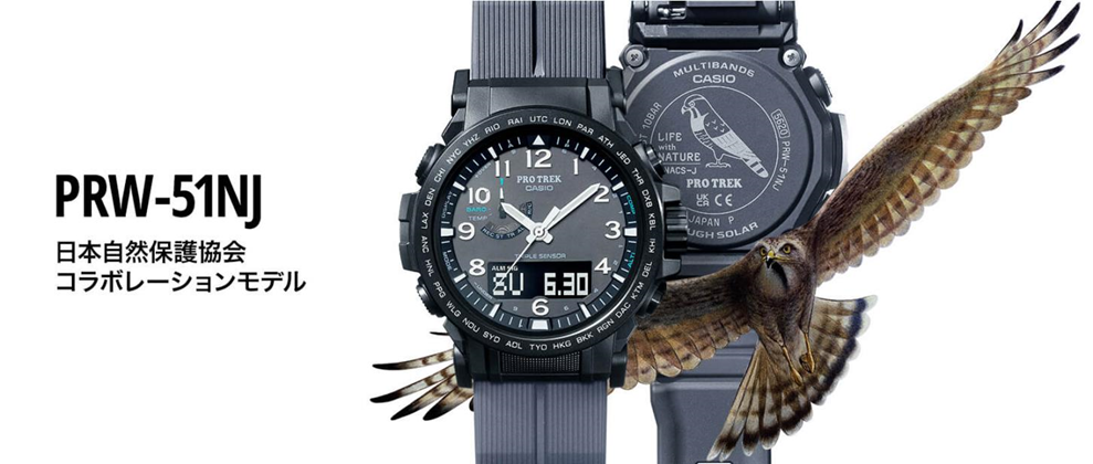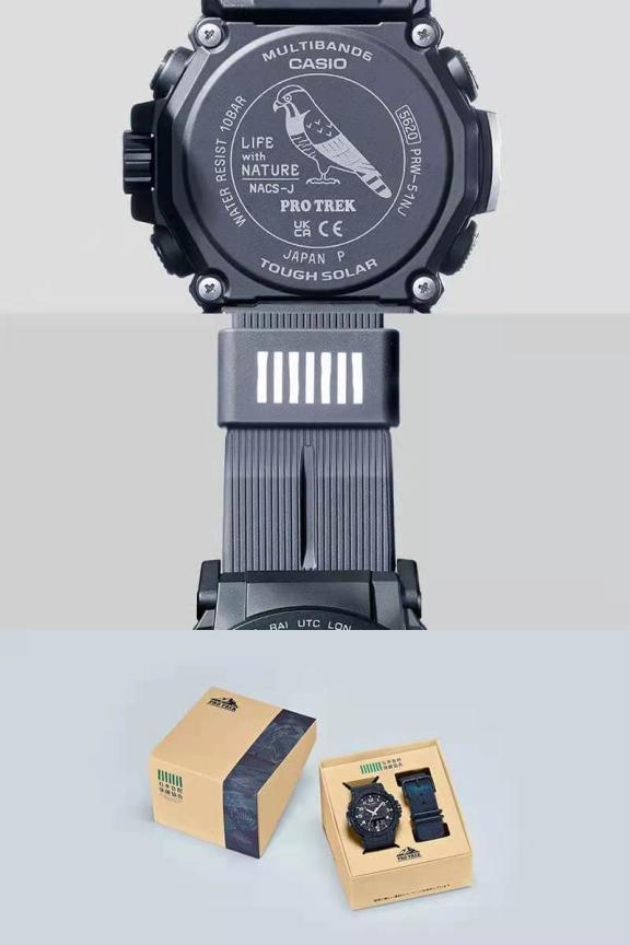同时,PRW-51NJ系列亦配备了一根绘有生活山林中动植物插图的替换表带,其图案设计灵感来源于山林间大自然的生物。日本山林间最具象征性的动物是鹰,因此,鹰的图案不仅被印在表带上,也出现在了背刻上,以及表带采用再生涤纶材质,响应日本自然保护协会正在推进的保护山林活动。