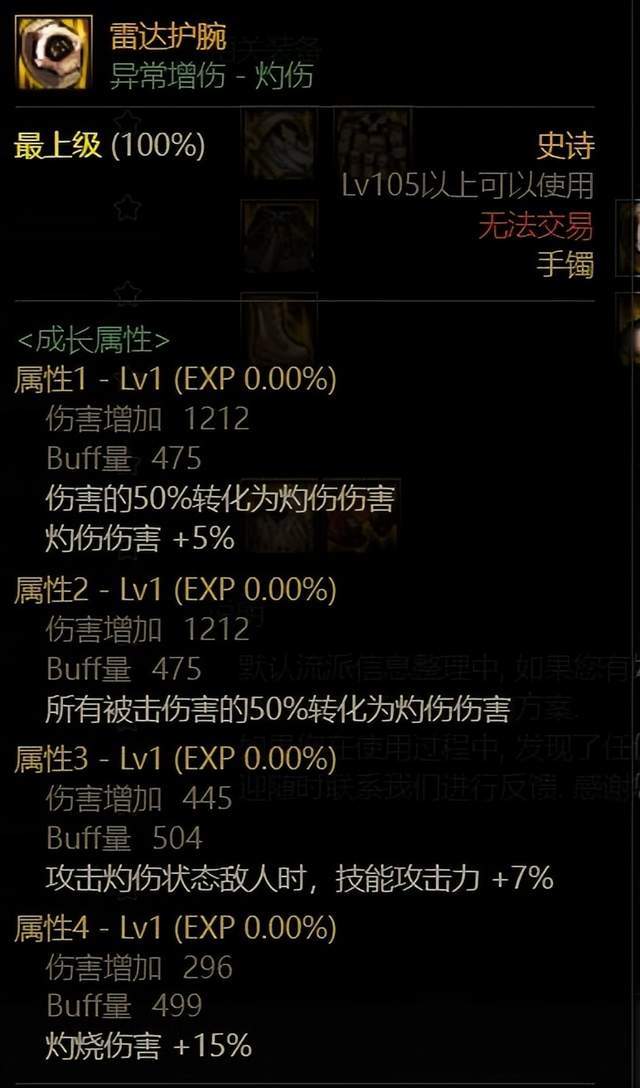 这件装备将伤害的50%转化成灼伤伤害,然后增加了灼伤伤害20%,这就相当于提供了10%技能攻击力(0.5*0.2=0.1)