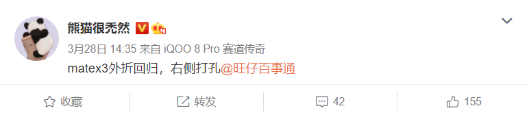 据微博博主 @熊猫很秃然 和 @旺仔百事通 爆料称 ,华为 Mate X3 折叠屏“外折”回归,并且采用右侧打孔设计。