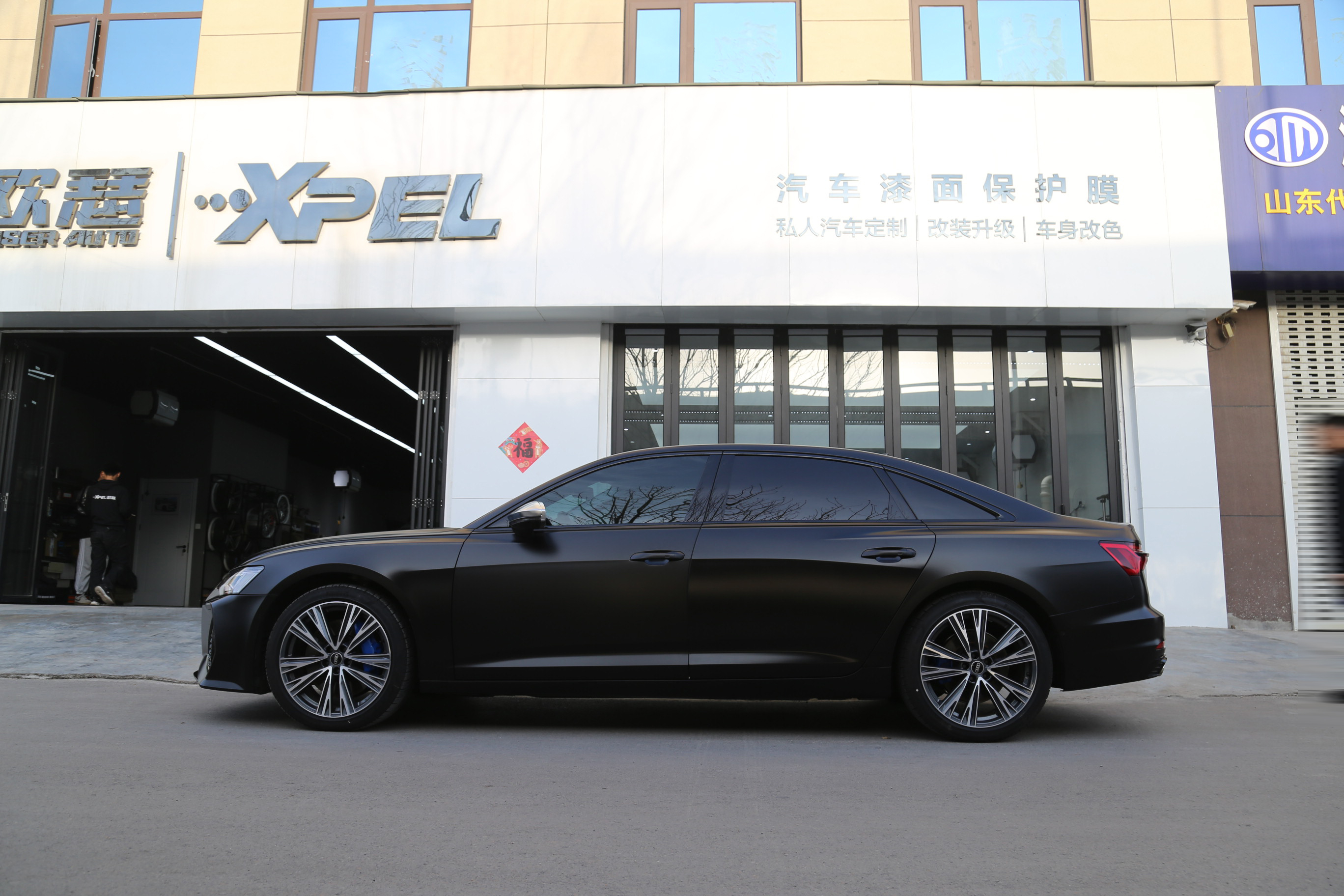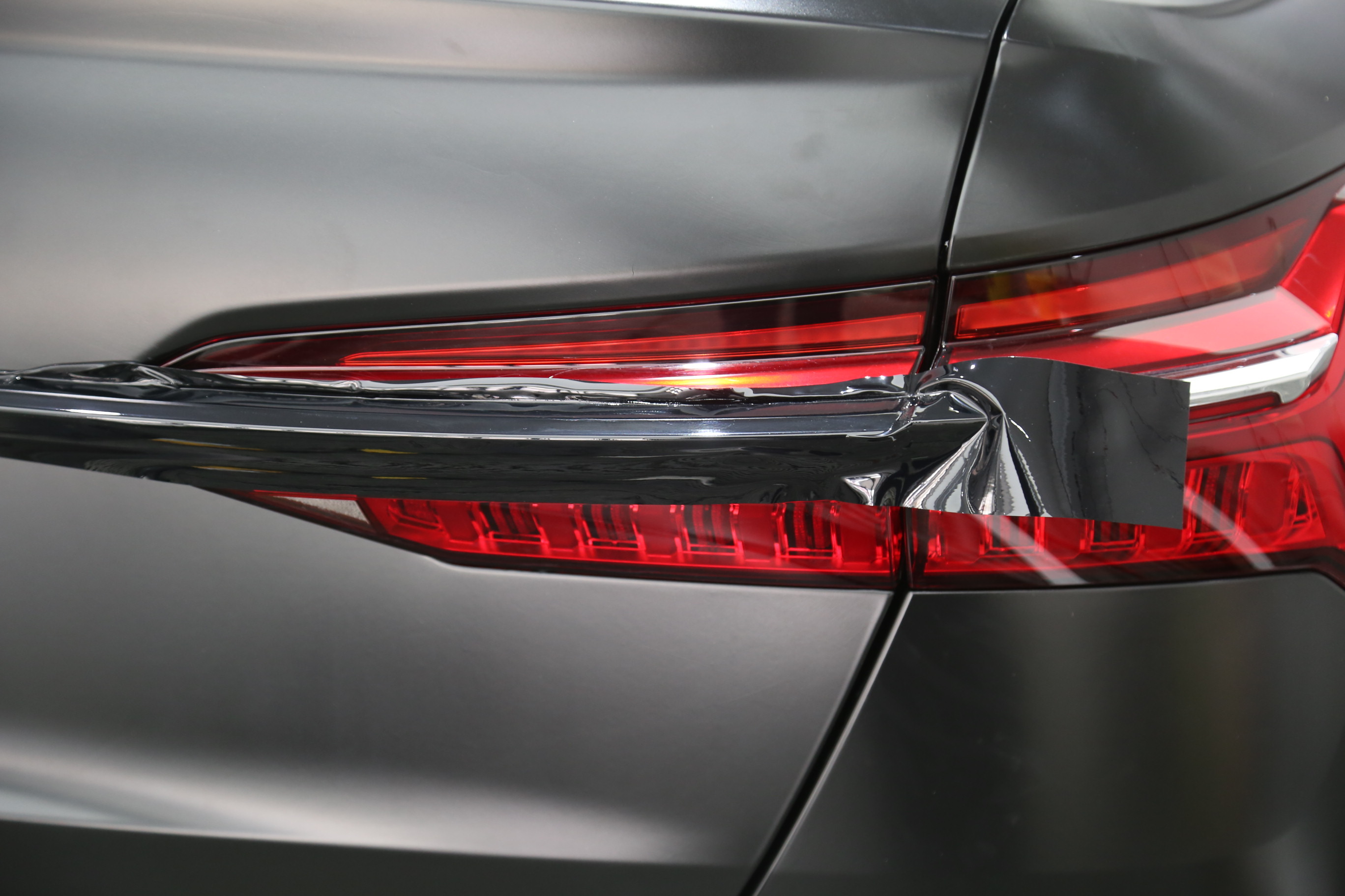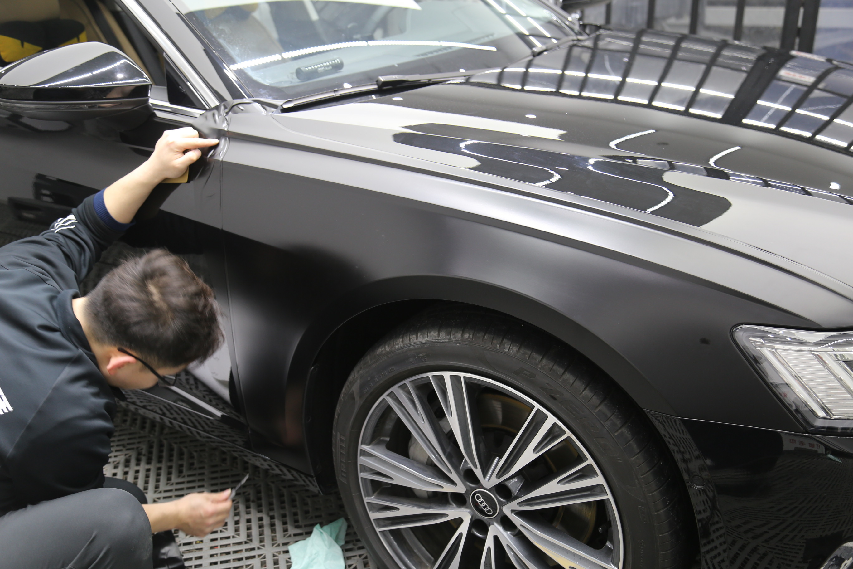 接车检查我们会详细记录车身各部位状态并和客户确认,避免引起误会。这台车也是走的黑武士风格,原车是黑色,再贴个更有质感的陶瓷黑改色膜,全车镀铬条也要贴成黑色,让整体更加统一。前杠升级一套RS6的前杠,运动风更强烈,当然也少不了奥迪的标志性银耳后视镜。