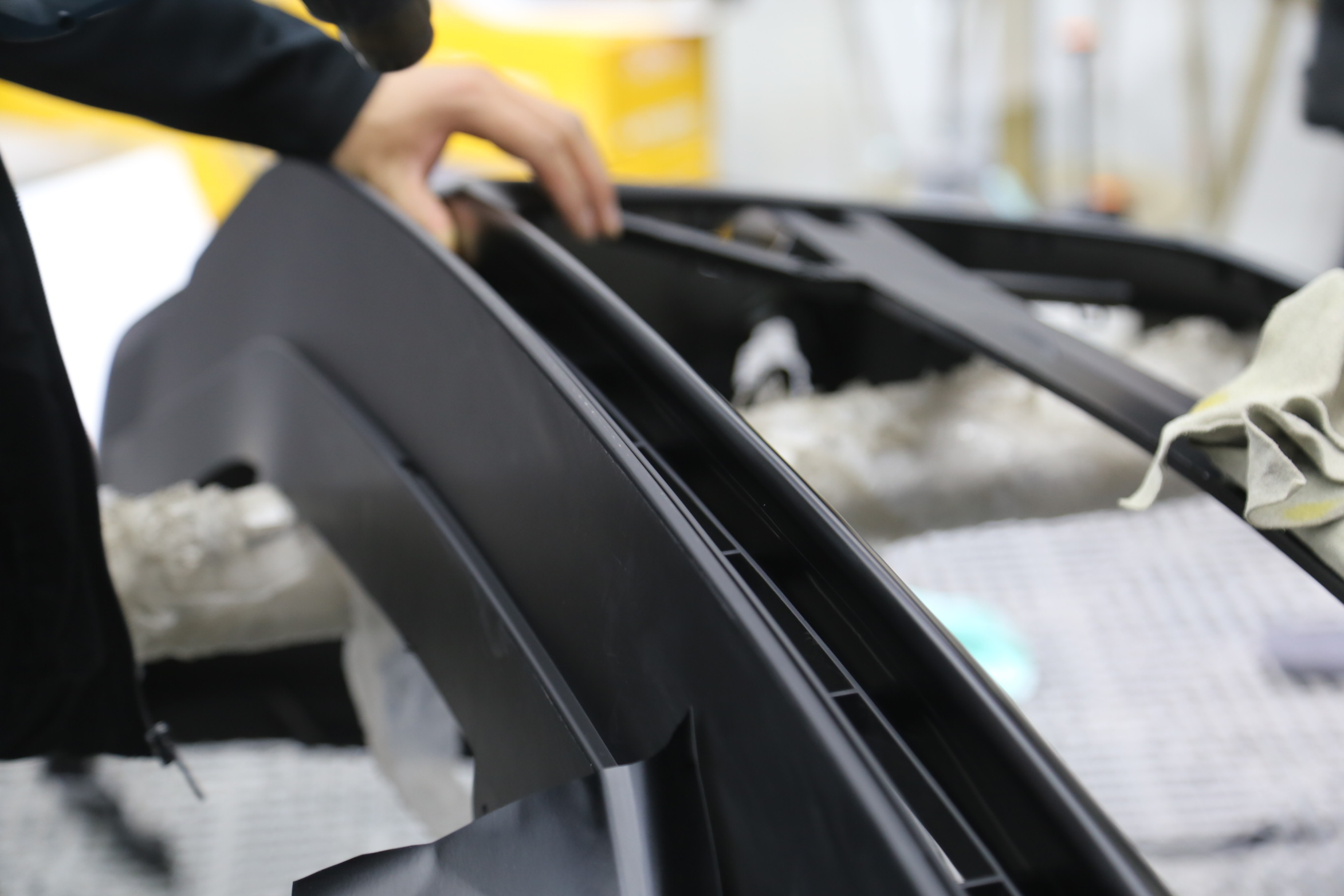 贴膜前的清洗工作非常重要,不仅要把表面的污渍清除干净,还要用软毛刷清洁缝隙,并把肉眼难以识别的水渍及角质等用洗车泥进一步清洁。