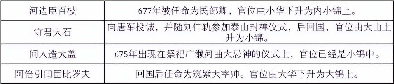 参与白江战役的诸位倭国将领们,有战死记录的仅有朴市秦造田来津一人,另外有4名回到倭国的倭军将领则有升官的记录:
