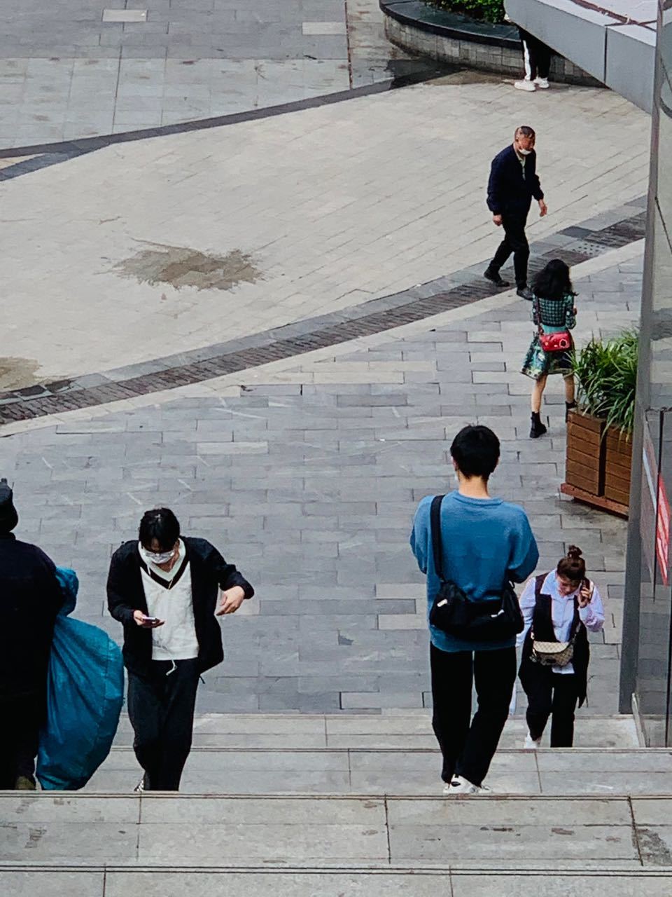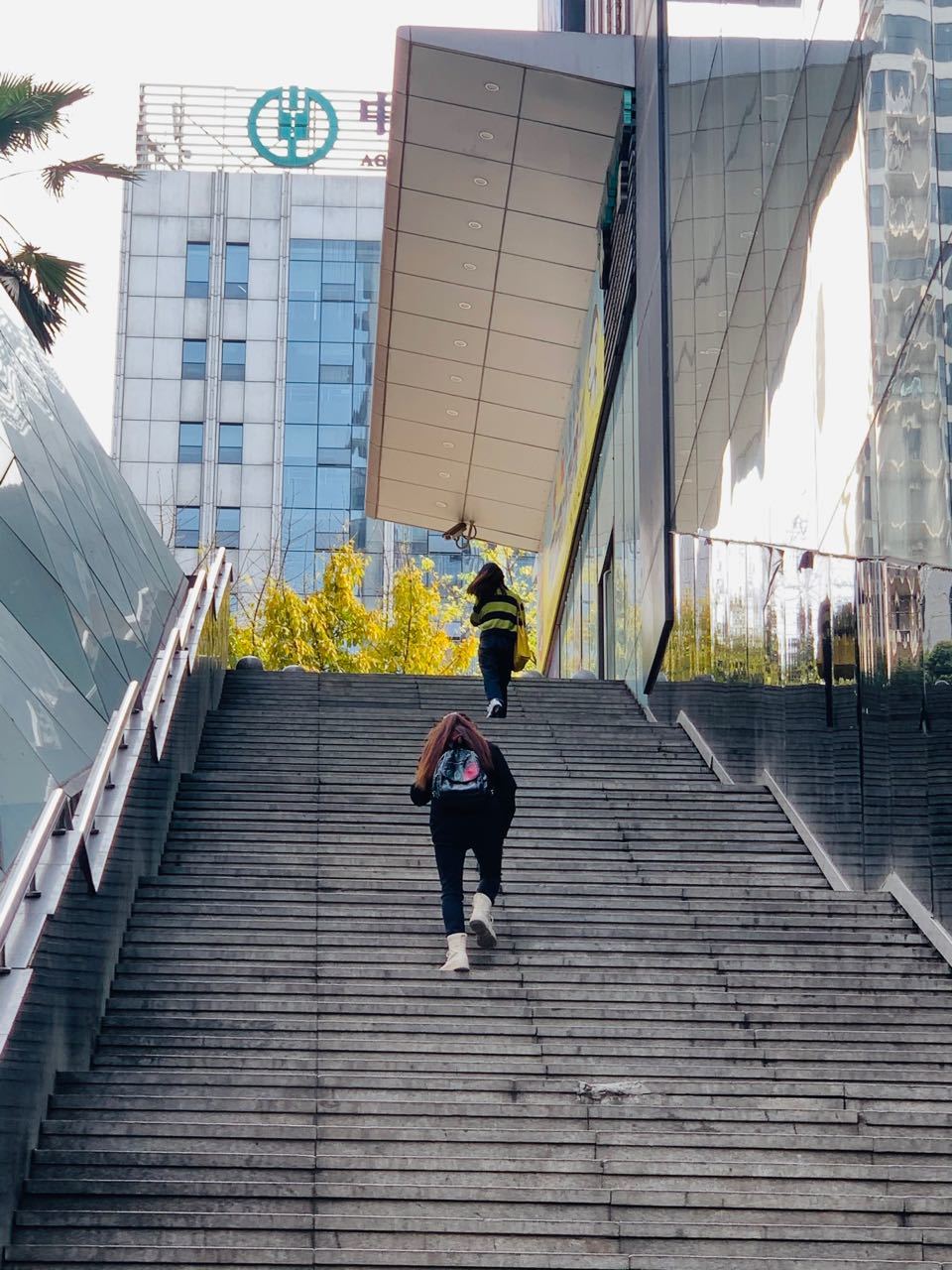 阿姨们背后的台阶,就是南坪万达广场的最有代表性的地标,一般向上走的人都会低头玩手机,走一会儿歇一会儿,向下走的人则需要更加小心,如果摔下去就出大问题了。