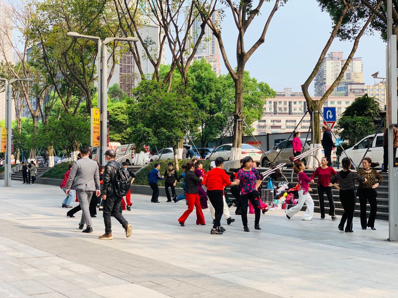 最高处的入口靠近重庆轨道交通3号线和公交车站,人们来来往往,是平日里最热闹的地方,早上和晚上,还会有许多阿姨在这里跳广场舞,路过的行人都被阿姨美丽的舞姿吸引。