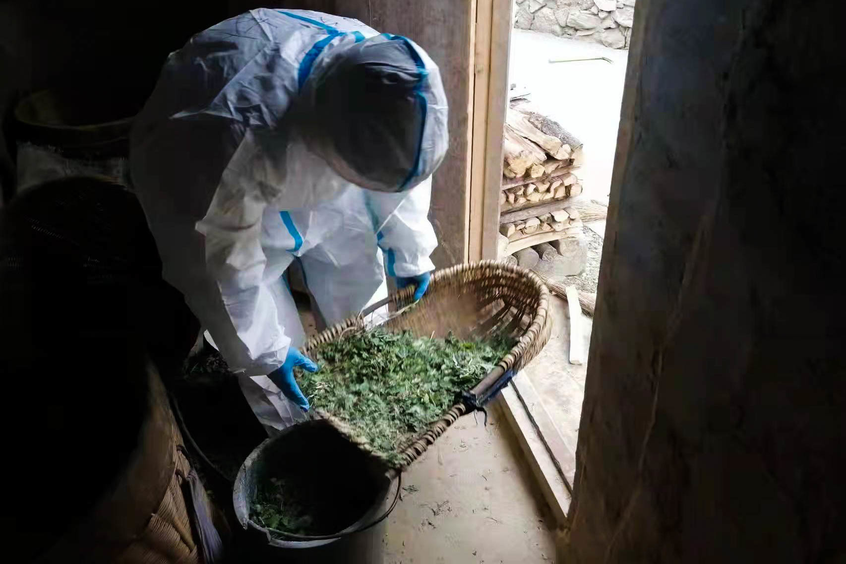“逆行饲养队”队员在村民家里拌饲料。(受访者供图)