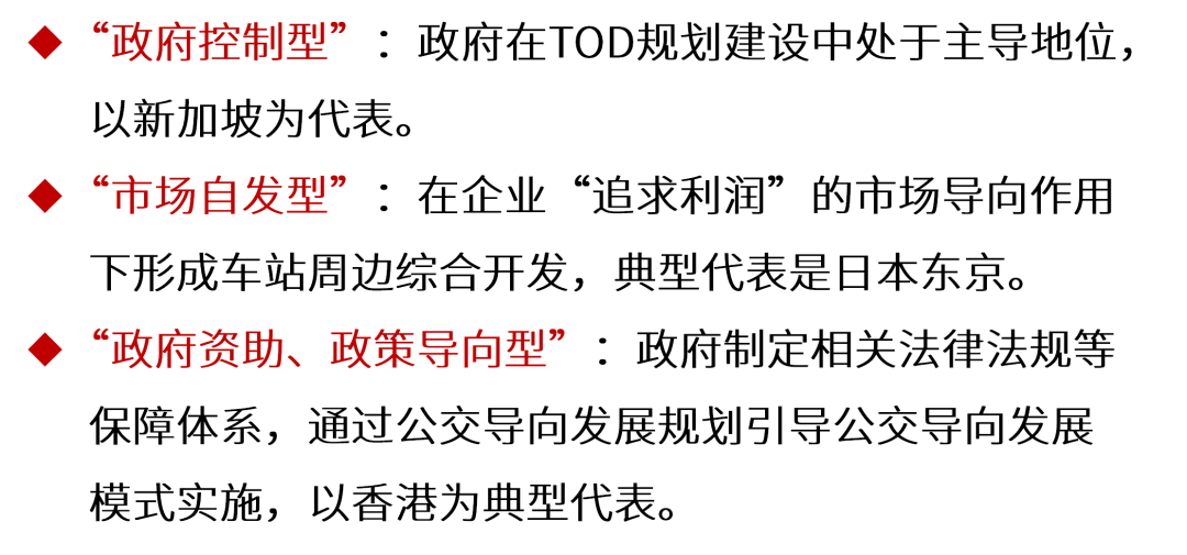 对比不同国家城市的TOD开发模式,总体可以分为“政府控制型”、“市场自发型”和“政府资助、政策导向型”三种。目前我国TOD项目属于“政府资助、政策导向型”。