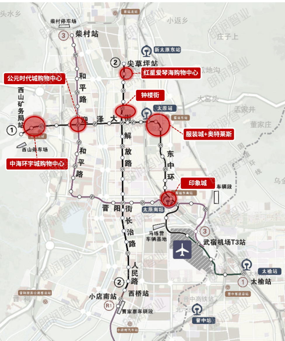 公元时代城购物中心(在营业)位于下元商圈,拥有地铁1号线、3号线双地铁规划轨道,是目前太原市不多的双地铁上盖项目,同样是太原市重点打造的TOD示范区,未来可改造将地铁出入口与商场连通,带来充沛客流量的同时,也为其商业地位提供了保障。