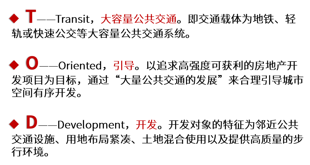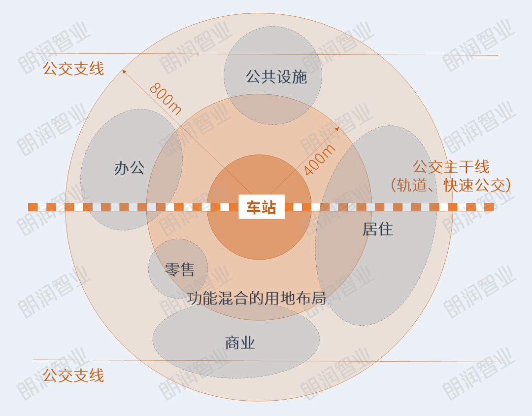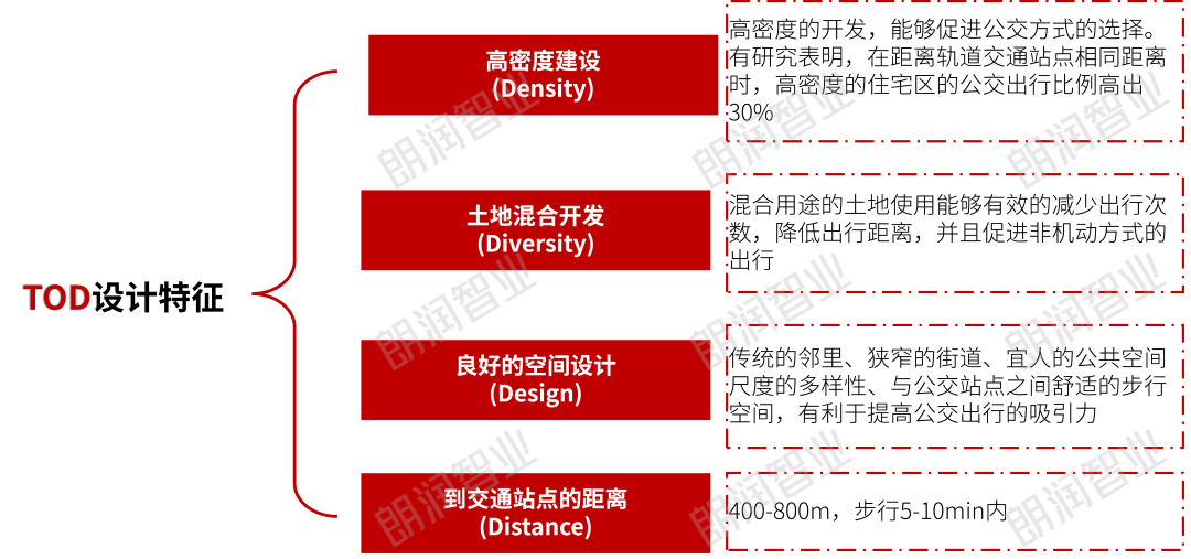 TOD模式是“以公共交通为导向” ,使公共交通的使用最大化的一种非汽车化的规划设计方式,通常以公交站点为中心、以400~800m(步行5~10分钟路程)为半径建立中心广场或城市中心,其特点在于集工作、商业、文化、教育、居住等为一体的“混合用途”城区,以实现各个城市组团紧凑型开发的有机协调。