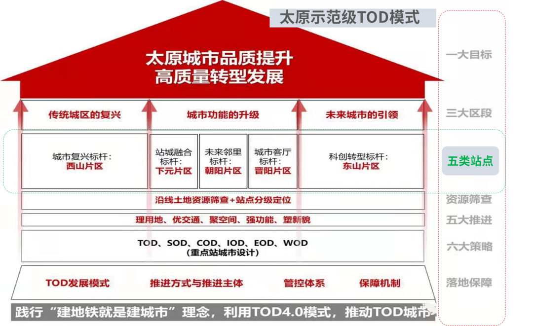太原重点打造的5大示范重点站,其城市设计以交通(TOD)和智慧(WOD)为基础,以生态(EOD),生产(IOD产业),生活(SOD公服配套)“三生”融合激发城市活力,以文化焦点(COD)打造为引领的6OD开发理念,多层次多维度全方位引领,实现沿线新旧动能转换,促进城市更新与高质量发展。