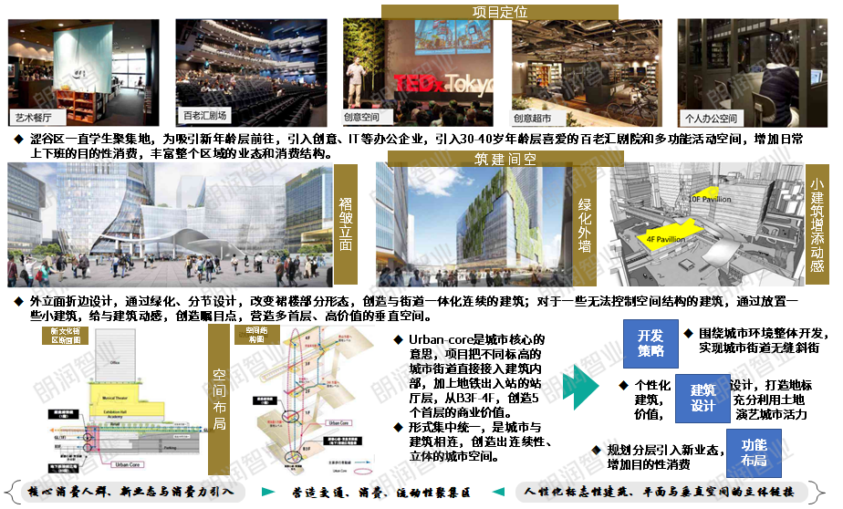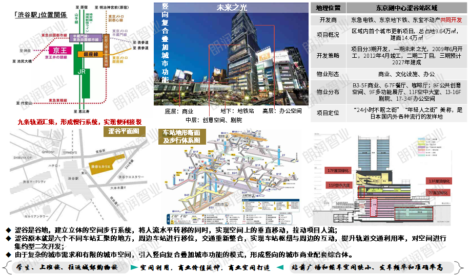 涩谷未来之光借助引入城市公共空间,电梯、垂直交通取代街道,由单一的交通、商业功能转型为国际创意性办公、娱乐、观光等综合性中心城区。定位30岁左右主力客群,外立面折边设计,通过夸大人性化设计,打造区域内标志性建筑物,拉动目的性消费。
