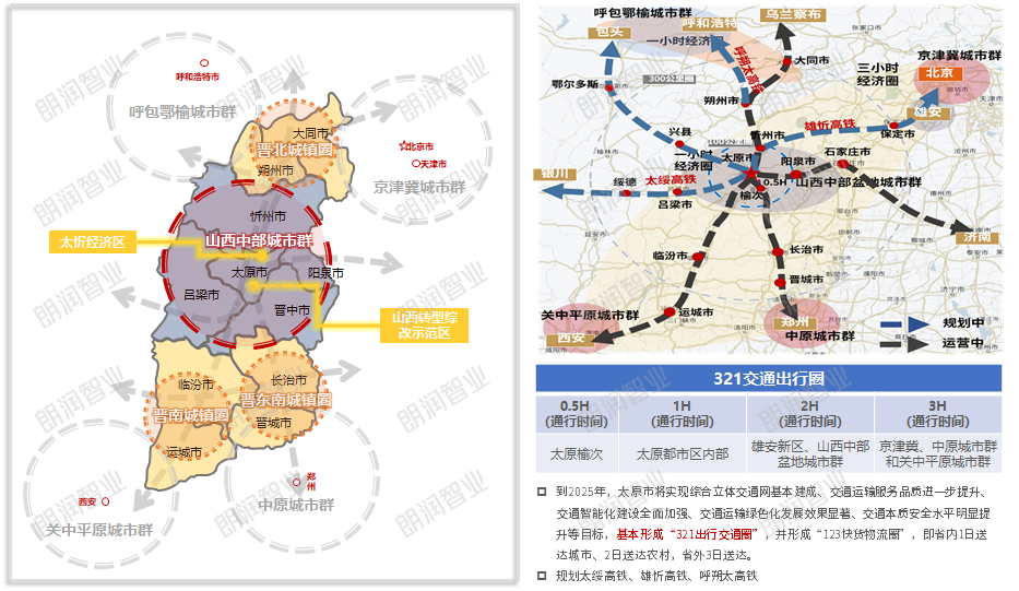 在国家级战略“一群两区三圈”的发展布局下,太原市作为省会城市,重点提升城市辐射带动力,积极建设“321交通出行圈”,完善道路交通建设体系,形成道路交通与轨道交通有机结合,将主城区与外围县市联通,为后期城市空间扩张、经济发展及内部革新发展做好奠基。