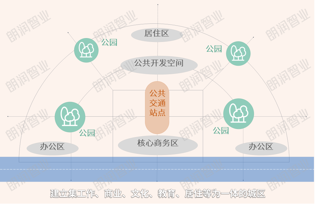 TOD模式遵循“以人为中心”、“土地高效开发”、“混合功能”、“良性循环”、“优化城市结构”及“高效可达性”六大开发理念。