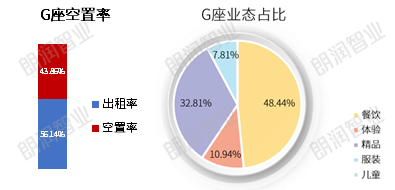 G座整体空置率较高,业态偏向于餐饮居多,其次是精品业态。国金中心是白领办公人群的聚集地,业态配置相对符合人群需求。