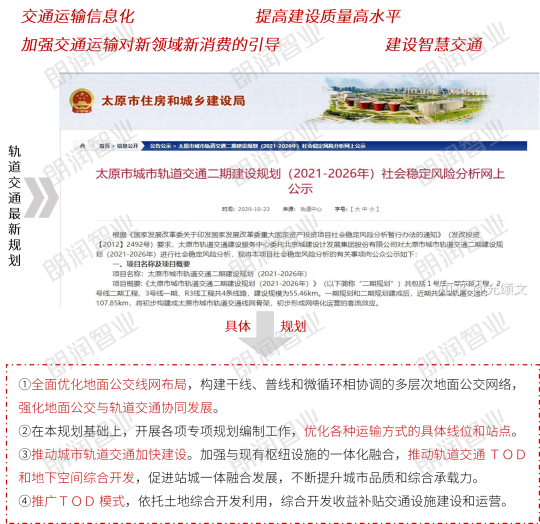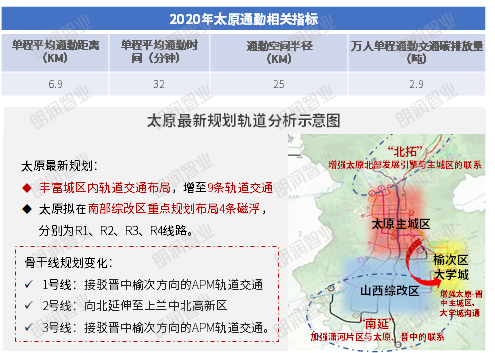 在太原轨道交通最新规划中指出,加快推进两市道路对接,集中解决“断头路”“瓶颈路”问题,提高交通的顺畅性。完善城市公共交通、地铁系统的建设,发挥轨道交通优势,以沿线数个“地铁经济区”的辐射带动效应,具备影响整个区域能级甚至城市格局的高阶资源的能力。建设“智慧交通,智慧城市”。