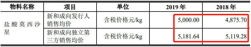 发行人向新和成采购材料主要为盐酸莫西沙星原料药,公司解释道因其盐酸莫西沙星属于特色原料药,不存在公开的市场价格,因此采购价由双方在参考同型号产品市场价格基础上协商进行确定。我们将新和成向发行人销售该产品价格与向除发行人外独立第三方销售同型号产品的价格对比后,可以看出,新和成向发行人的销售均价低于向独立第三方的售价。
