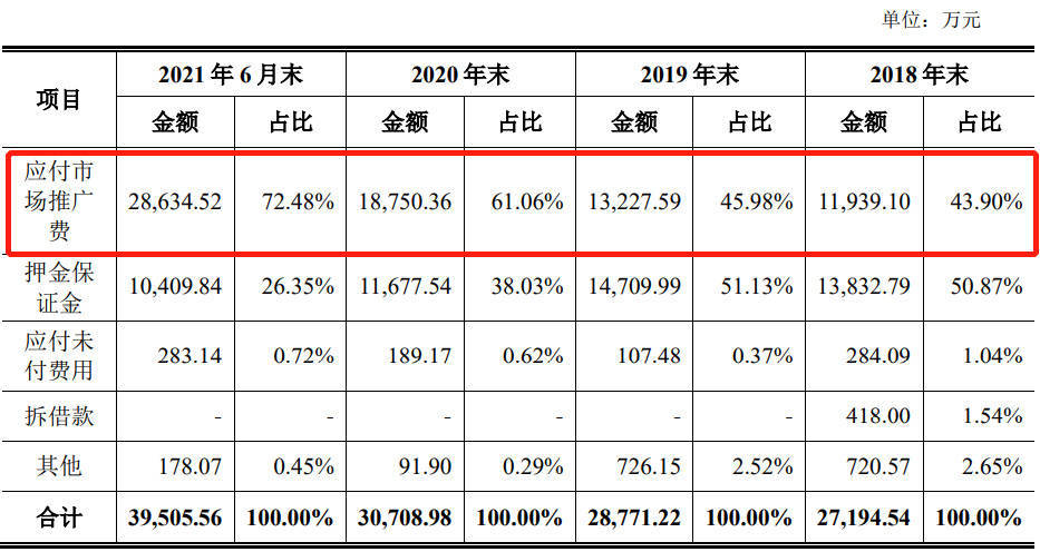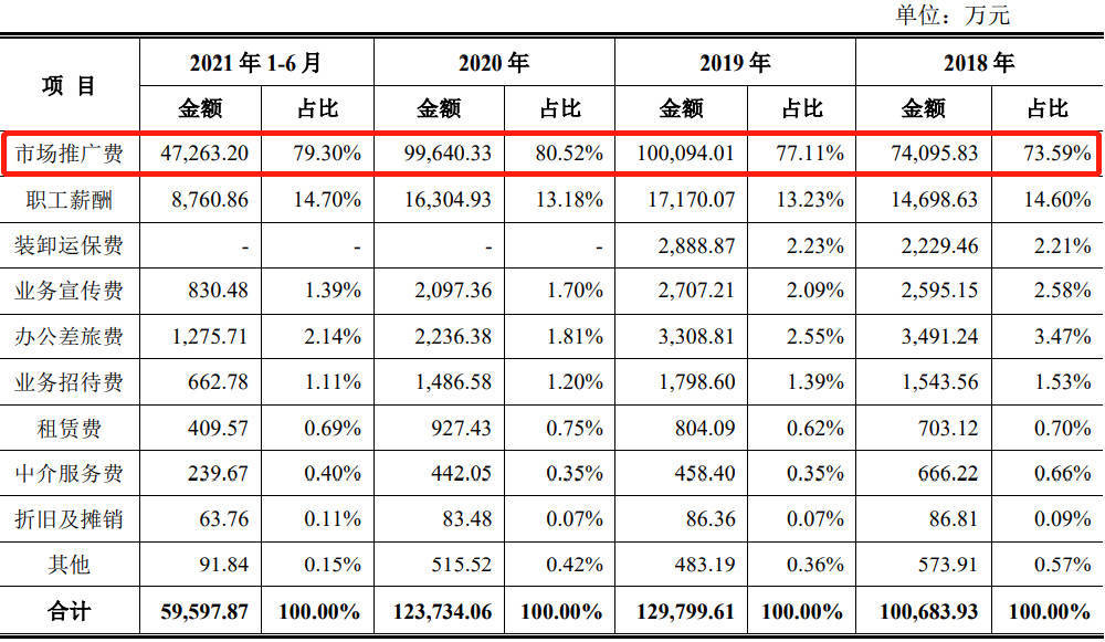 发行人的销售费用中金额最高是市场推广费,分别为74,095.83万元、100,094.01万元、99,640.33万元及47,263.20万元,占销售费用比例分别为73.59%、77.11%、80.52%及79.30%。