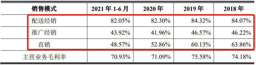 报告期各期,按照销售模式划分,发行人在配送经销的销售模式下毛利率最高,保持在82%以上,且与其他销售模式下的毛利率相比差异较大。配送经销模式下的毛利率与推广经销模式相比高出近一倍,直销模式下的毛利率与推广经销模式下的毛利水平差距较小,但与配送经销模式相比仍有较大差距。
